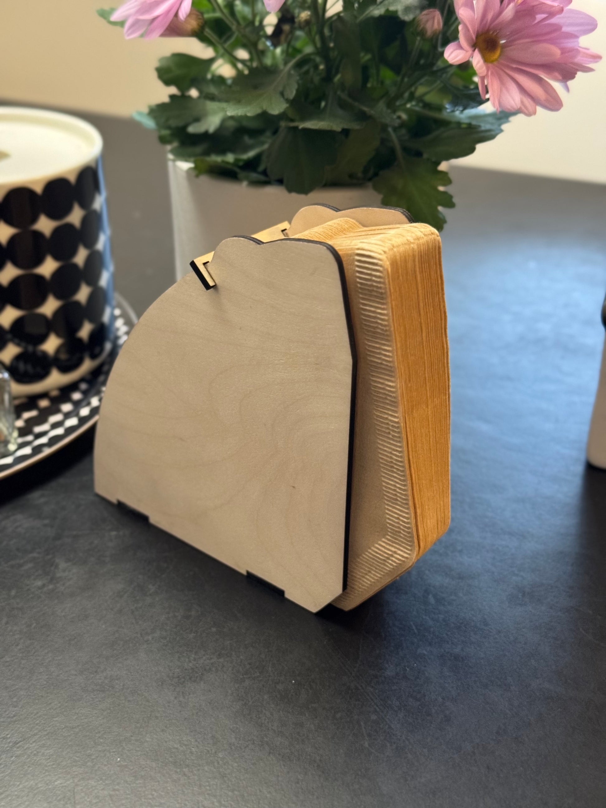 Koivuvanerista valmistettu teline kahvin suodatinpusseille. Yleisemmälle 1x4 pussikoolle